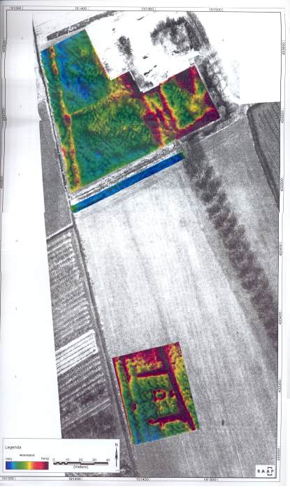 rechthoekige structuur, waarvan met zand en puin opgevulde greppels zijn