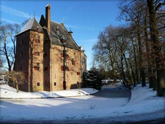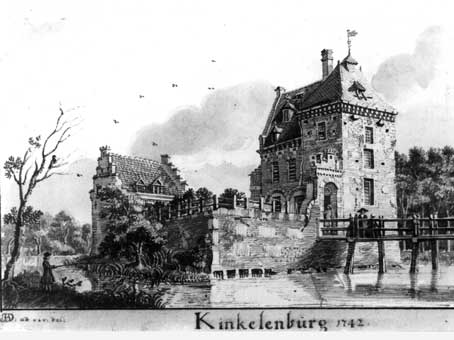In de 14e en 15e eeuw is het een woontoren, de omwalling en links voor op de omwalling een huis met trapgevel.