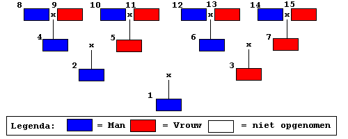 nr. 5, grootouders van moeders kant nr. 6 en nr. 7, de overgrootouders nrs. 8 t/m 15, enzovoort.