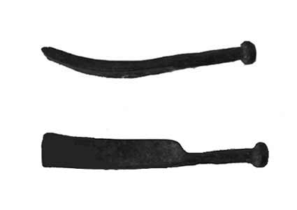 Bovenstaand voorwerp is van smeedijzer en 29 cm lang. Aan de ene kant een afgeplatte knop en een blad dat asymmetirisch de steel vast zit. Het blad is gebogen en het ziet er niet naar uit dat dit verbogen is. Het is gevonden in Bemmel in de uiterwaarden, maar niet duidelijk is of dit in de weilanden of uit het grintgat komt.